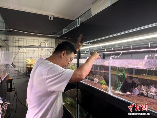 台青关立廷在位于上海的工作室里检查水晶虾养殖状况。 谢梦圆 摄