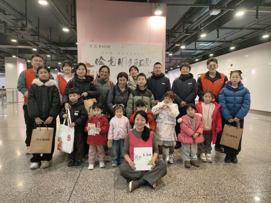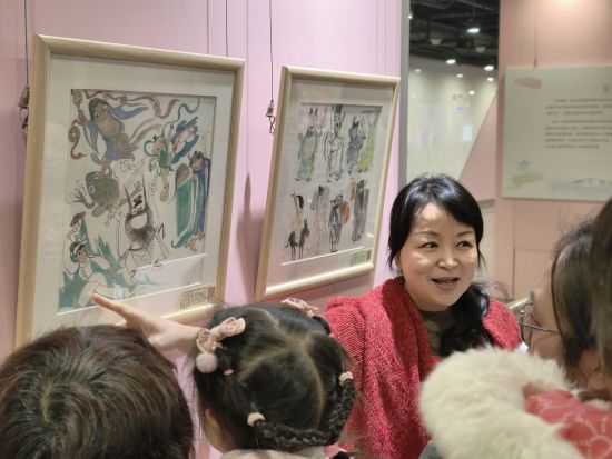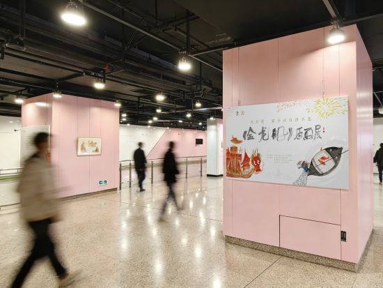 在十五号线顾村公园站的站厅里,《金龙船》绘本主编吴斌荣正带着多组亲子家庭驻足画前,细细讲解一幅幅水墨原稿背后的故事。“让‘大肚皮’的故事,随着地铁运行的脉搏,陪伴市民的每一次出行,”她笑着说道,“正是选择在这里办展的一份初心。”一位共同参观的孩子家长也感慨道:“把‘罗店划龙船’这样地道的非遗故事,用水墨画带到地铁里,让赶路的时间也变得丰富起来。”