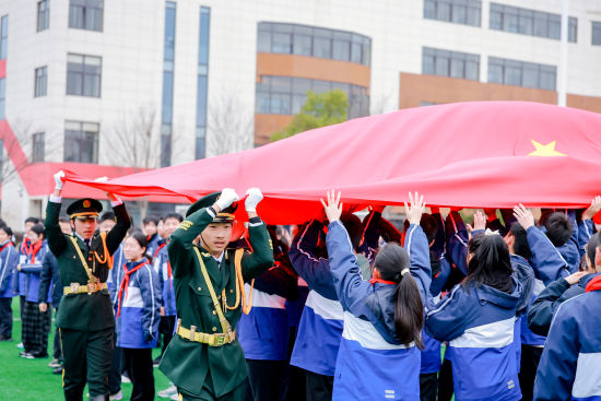 当天上午,董立敢老师走进校园,与青浦区思源中学全体师生共同见证了一场震撼人心的“国旗在我心中”新学期升旗仪式。在董立敢老师的亲自指挥下,思源中学国旗仪仗队队员们步伐坚地护送“中国第一旗”从同学们头顶略过,大家纷纷抬头仰望、伸长手臂与鲜艳的“中国第一旗”进行了一次神圣而庄严的“零距离”接触。中国人民解放军仪仗司礼大队原空军分队长、中国人民抗日战争暨世界反法西斯战争胜利80周年纪念活动阅兵教练员王杰作国旗下讲话。壮观的“中国第一旗”与国旗下讲话被全校师生凝聚为共同的记忆,五星红旗将永远飘扬在大家心中。