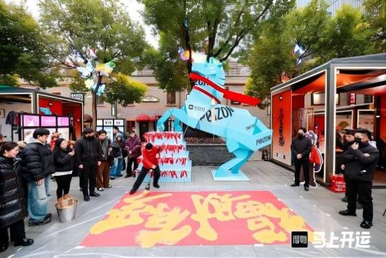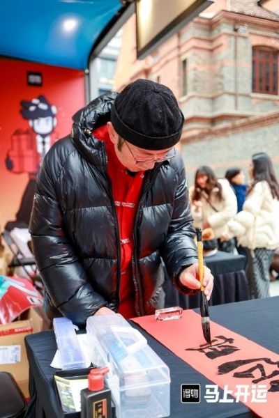 中新网上海新闻2月11日电(记者 康玉湛) 近日,上海虹口文化地标今潮8弄,一场融合传统年俗与现代潮流的城市文化事件正在上演。得物App于马年新春前夕打造“马上开运”新春潮流派对,国潮书法场景开创者、南门书法创始人朱敬一受邀亲临现场,饱蘸金色墨汁,在巨大的红纸上挥就“福财运爱”与“马上全有”八个苍劲有力的大字,瞬间点燃了现场年轻人群的打卡热潮。