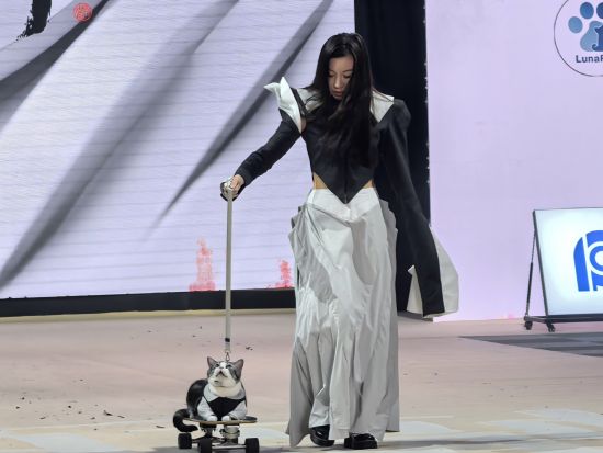 据悉,本次展演的全部作品均出自上海商学院艺术设计学院2022级服装与服饰设计专业学生的毕业设计。在专业教师指导下,学生们聚焦"亲宠时尚设计"主题,共完成19个系列、38套人宠配套服装以及5款宠物推车和多款采用杜邦纸等可持续材料制作的宠物出行包。学生们的设计作品覆盖犬、猫等常见宠物,同时延伸至北美红狐、安哥拉兔等小众宠物类型;应用场景涵盖日常家居、休闲出游、主题派对及功能性防护等多个维度。记者看到,在T台参与展示的动物模特包括:大丹犬、缅因猫、边牧犬、灵缇犬、兔子、狐狸等。
