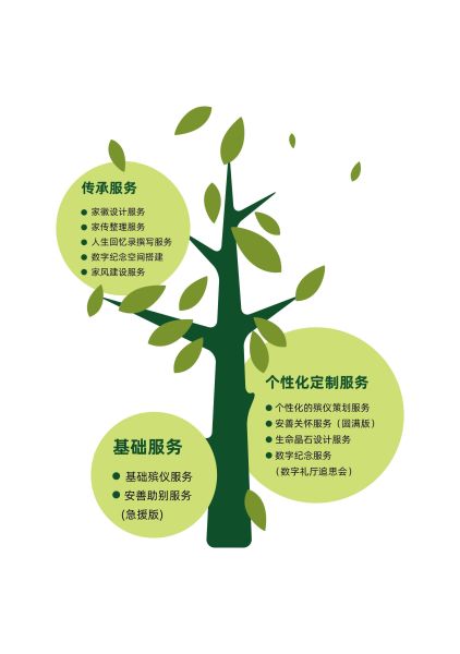 基础保障类以《安善应急服务》《殡仪基础》为主,主要解决临终陪伴需求以及确保告别过程体面简约;个性定制类包括个性化的殡仪策划、安善关怀服务、生命晶石、数字纪念服务等;家庭传承类则通过家徽设计、家传整理、人生回忆录、数字纪念空间、家风建设等模块。