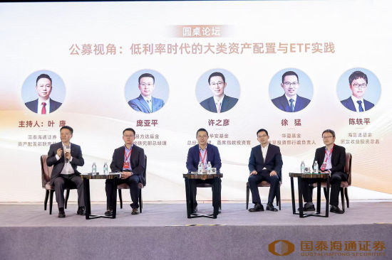 第二场公募圆桌论坛由国泰海通证券财富管理委员会委员、资产配置部联席总经理叶康主持,合计管理规模超过8500亿元的ETF基金经理同台论道:华安基金总经理助理、指数与量化投资部高级总监许之彦,华夏基金数量投资部行政负责人徐猛,易方达基金董事总经理、指数研究部总经理庞亚平,以及海富通基金固定收益投资总监陈轶平,共同探讨低利率时代的大类资产配置与ETF实践。今天参与圆桌讨论的嘉宾,分别管理着A股市场上规模领先的黄金ETF、港股ETF、宽基ETF以及债券ETF。嘉宾指出,在当前的市场环境下,大类资产配置的重要性日益凸显,而ETF正是落地各类配置方法论、提升投资获得感的高效工具。国泰海通面向各类客户提供专业客观的ETF配置服务:为互联网长尾及零售客户提供标准化组合,一键降低配置门槛;为企业与机构客户量身打造定制方案,精准匹配多元需求。