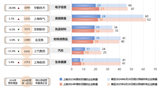 从行业分布来看,电子信息、高端装备、先进材料、时尚消费品领域企业在营收百强榜中占据较多席位,分别有23、22、19、18家企业上榜;汽车、生命健康领域上榜企业相对较少,分别有10、8家企业上榜。其中,电子信息领域企业营收能力有所增强,新增3家营收百强企业(澜起科技、恒玄科技、上海贝岭),超八成百强企业2024年营收实现正增长。高端装备领域企业盈利能力有待提升,本期营收百强企业减少1家,约四成百强企业2024年营收有所下滑。先进材料领域上榜企业与上期持平,实现正增长的企业居多,其中,合成生物企业凯赛生物重回百强榜单,2024年营收增速达39.9%。时尚消费品领域上榜企业较上期减少1家,过半数百强企业的业绩有所下滑,头部企业金龙鱼、老凤祥、光明乳业业绩承压态势进一步凸显。汽车领域上榜企业减少1家,头部企业上汽集团营收从七千亿级收缩至六千亿级,营收同比下降15.4%。生命健康领域上榜企业较上期增加1家,为肿瘤药物研发企业艾力斯,头部企业上海医药2024年业绩保持稳健增长。从“三大先导产业”维度看,集成电路上榜企业数增至14家(新增澜起科技、恒玄科技、上海贝岭),生物医药领域上榜企业增加1家(艾力斯),人工智能领域上榜企业数量仍较少,只有1家企业上榜(科大智能)。