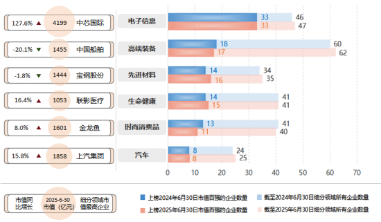 从行业分布来看,上海制造业市值百强企业约三成集中在电子信息领域,本期共有33家上榜企业,在榜企业总市值规模明显提升,较去年同期增长56.0%,是市值增幅最高的细分领域。高端装备领域有17家企业上榜,较上期减少1家。先进材料领域有16家企业上榜,较上期增加2家,中洲特材、华峰超纤等多家上市企业市值成倍增长。生命健康领域有15家企业上榜,较上期增加1家,在榜企业市值规模总体增长18.2%。时尚消费品领域有11家上榜企业,较上期减少2家。汽车领域有8家企业上榜,上榜企业数量较上期保持不变。从“三大先导产业”维度看,集成电路、生物医药领域有较多高市值规模公司,分别有20、11家企业上榜市值百强,上榜市值百强的企业较上榜营收百强的企业数均更多;人工智能领域进入市值百强的企业数量虽和进入营收百强的相同,但企业排名更靠前,反映三大先导产业企业的市场关注度较高。