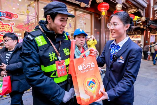 活动期间,一支支由建行上海黄浦支行青年员工组成的“张富清党员突击队”穿梭在人潮中,将一份份装有保暖用品的“关怀礼包”,送到正在工作的环卫工人、执勤保安手中,附上一句真诚的“辛苦了,新年好!”一位保洁阿姨接过礼包,连声道谢:“没想到能收到这份心意,很感动。”
