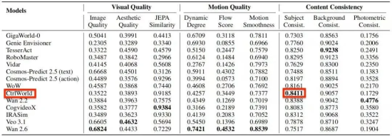 2026年2月,星动纪元创始人陈建宇团队与斯坦福大学ChelseaFinn团队联合研发的Ctrl-World世界模型,在全球具身智能权威测评WorldArena榜单中,一举击败谷歌、英伟达等国际科技巨头,斩获具身任务能力全球第一的佳绩,同时在主体一致性、轨迹精度、深度准确性、策略评估一致性四大核心维度全部登顶;其视频生成能力同样表现亮眼,排名全球第二,成为兼具“视频生成高质量”与“具身任务高实用”的顶级世界模型。