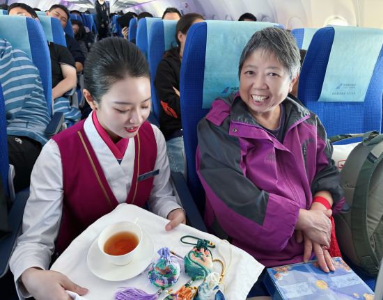 “欢迎登机,祝您重阳安康!”清晨的上海浦东机场,南航乘务员在登机口微笑着迎接各位旅客,送去祝福。待航班进入平飞阶段,乘务组用托盘端着菊花茶和茱萸香囊,逐一敬献给航班上的老年旅客,一句句暖心的话语,承载着对长辈健康长寿、幸福安康的美好祝愿。