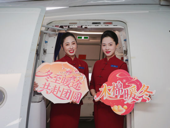 客舱内早已布置好浓厚的节气氛围——主题贴纸错落点缀舱内各处,将冬至的传统韵味与南航的木棉元素巧妙融合;乘务员身着雅致的铁锈红冬装旗袍,举手投足间尽显中式美学,成为客舱内靓丽的风景线。