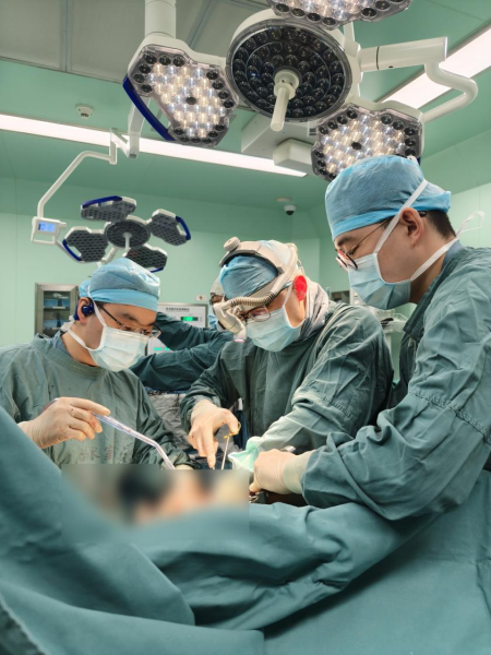 胰腺外科迅速集结胰腺肿瘤多学科团队,制定周密手术方案与应急预案。刘亮教授带领主治医师何俊义、住院医师张跃铭实施手术。腹腔打开后,情况比预想更为严峻:门静脉被肿瘤完全包裹,强行剥离极易导致血管撕裂。专家团队当机立断,采用“先架桥减压,再切除肿瘤,最后重建血流”的创新方案。这如同在洪水决堤前开挖分流渠,医生在肿瘤两端搭建人工血管临时通道,缓解门静脉系统淤堵压力,让濒临破裂的曲张血管得以 “喘息”,为后续切除肿瘤创造安全条件。