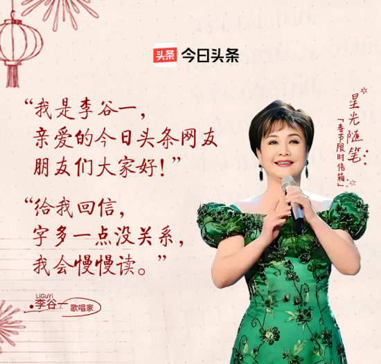 歌唱家李谷一,也在给头条网友的春节信件中写下专属春晚记忆。她深情回望1983年首届央视春晚的难忘经历,还揭秘了《难忘今宵》的创作始末。虽将缺席2026年央视春晚,但李谷一仍会以文字形式与观众共度新春,真诚邀约网友写下长信,并承诺会认真阅读,并将选择一位网友亲自回信。